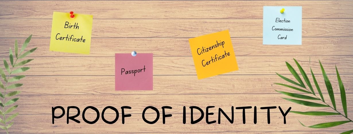 A Birth Certificate, Passport, or Citizenship Certificate can be presented as evidence of your identity. All the documents should be in English.